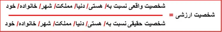 - شخصیت ارزشی: نسبت شخصیت واقعی به شخصیت حقیقی را شخصیت ارزشی می گوییم که در واقع معیاری برای ارزیابی ارزشی شخصیت یک فرد را به منظور خودشناسی ارائه می دهد.