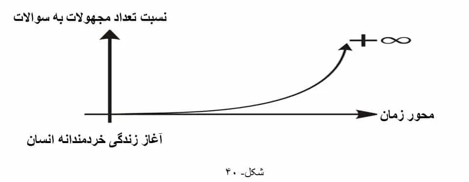 نمودار بالا نشان می دهد که انسان در ابتدا فقط چند سوال داشته و به تدریج با گذشت زمان، سوالات او به شاخههای علمی تبدیل گشته و آن شاخهها نیز همان طوری که توضیح داده شد، دوباره به طرح سوالات جدید منجر شده است. به طوری که تعداد سؤالات مطرح شده در چند دهه اخیر، از تعداد سؤالات مطرح شده در طول تاریخ بیشتر بوده و در حال حاضر انسان با چنان وضعیتی روبروست که باید منتظر دوران بحران سوال بود. نمودار زیر، افزایش میزان نسبت مجهولات به معلومات و میل مجهولات به سمت بینهایت را نسبت به مرور زمان نشان می دهد.